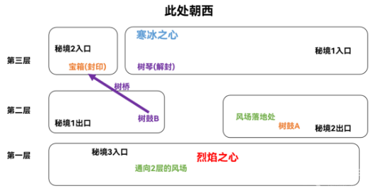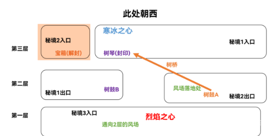 14、此时我们无法通过树桥返回寒冰之心上层了,秘境现在的状态示意图如下: