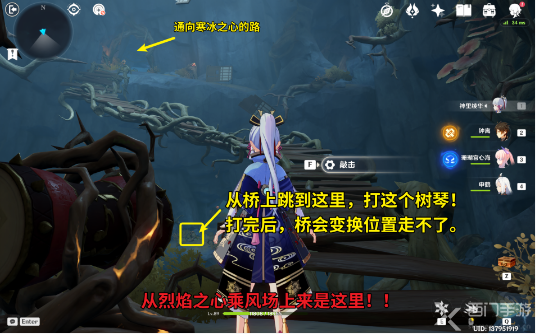 13、在通向上层的桥这里,我们跳到秘境1的出口处,先打一下秘境1出口(外面)的树鼓,此时,树桥会更换位置,同时寒冰之心外面的音律树琴会解封(有动画提示);