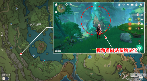 2、然后玩家可以任选一处可以观察到法留纳法宝全貌的位置,也可以直接参考下图这个位置: