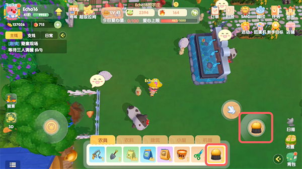 4.来到需要提升好感度的家禽旁边,例如鸡,在下方工具栏选择需要用的【毛刷】,点击右侧的按钮;