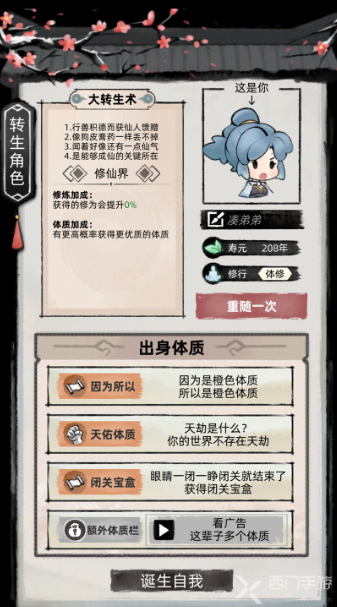 在游戏中开局就可以选择体质,有各种不同的品质,其中红色、橙色是比较不错的,不过具体选择其实对玩家的影响不大,只要选择没有天劫的就行,比如可以选择【天佑体质】,这个体质可以直接晋升,不需要渡劫,品质的话,大家尽量刷到红色、橙色的就行,如果实在没有紫色也可以考虑。
