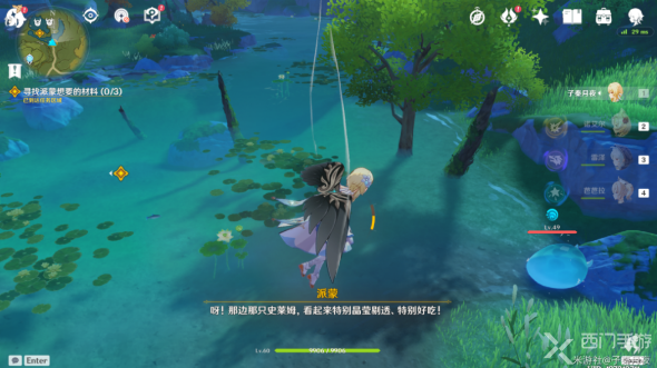 2、跟着指引走,到达位置后可以看到有一只蓝色的水史莱姆,玩家击败史莱姆,可以获得鲜美的是拉姆凝液;
