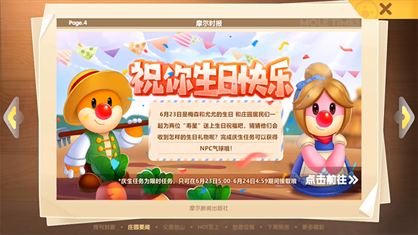 在每一年的6月23日是梅森和尤尤的生日,在这一天进入游戏为梅森和尤尤送上生日祝福,完成庆生任务就可以获得到NPC生日气球。