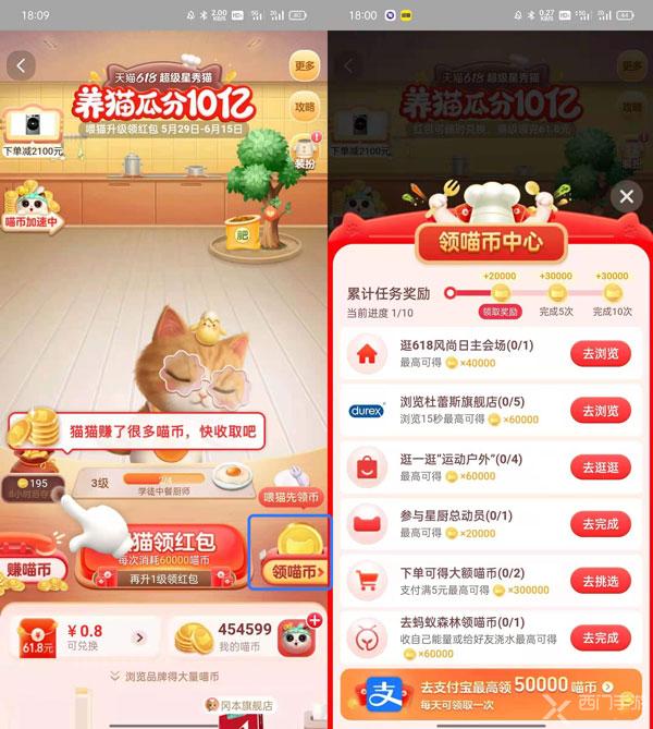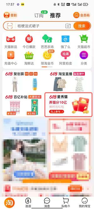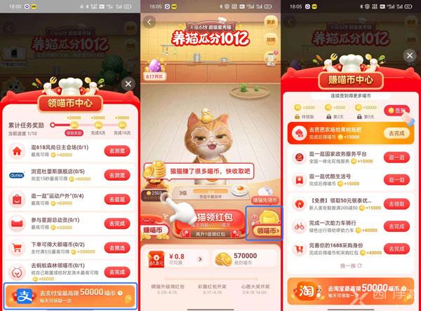 1.打开淘宝app,在首页点击【618超级星秀猫】进入活动,参与养猫领红包活动;