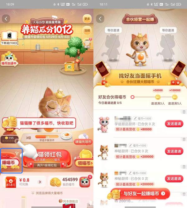 7.【邀请好友】:在活动页面的左下角的【赚喵币】进入页面,和好友面对面摇晃手机即可邀请好友,也可以发送邀请给好友来邀请,邀请3人、5人可获得5W、10W喵币。