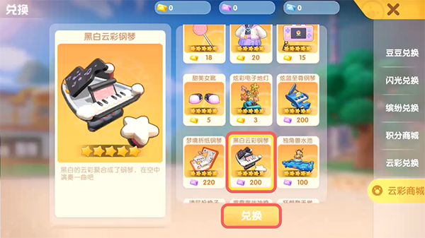 ③在云彩商城中找到【黑白云彩钢琴】,点击【兑换】消耗200云彩紫券兑换获得。