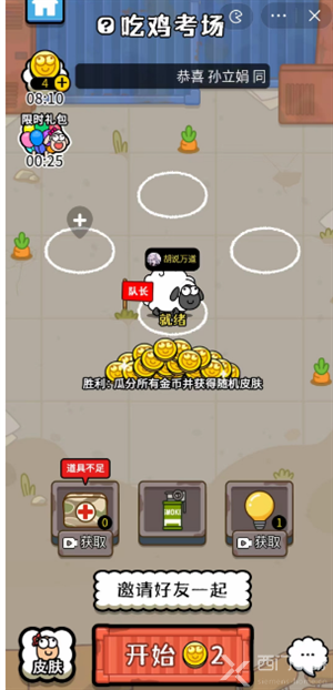 1、打开游戏,点击“开始”,消耗2个金币开始吃鸡答题,也可点击“邀请好友一起”和好友一起玩;