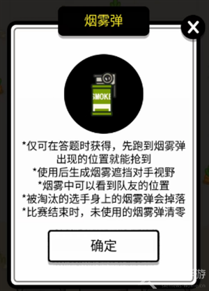 2、烟雾弹:可在答题过程中,跑到烟雾弹出现的位置获得,使用后生成演武遮挡对手视野;