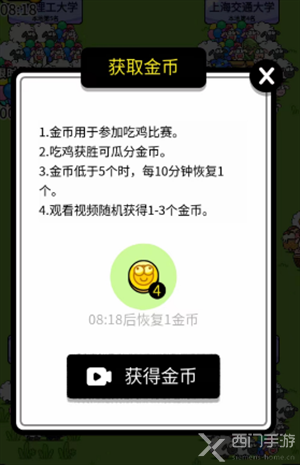 5、金币是用于答题吃鸡的,每次需要消耗2枚金币,看视频可获得1-3个金币,当金币低于5个,每10分钟恢复一个金币,也可以通过吃鸡瓜分金币。
