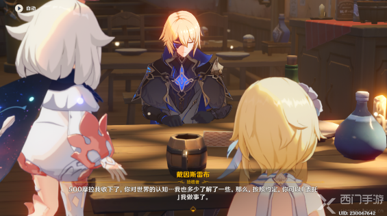 与戴因斯雷布对话,在支付500摩拉和回答他三个问题后,推进任务流程阶段。(回答的问题答案可以任意,并不会影响任务流程。)