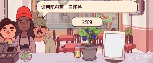 1、在游戏中玩家只能看到顾客要求的是一个披萨怪兽,很多玩家不知道披萨怪兽要怎么做,使用哪些配料,但是通过询问就知道顾客的需求,就是用配料去画一个怪兽的样子;