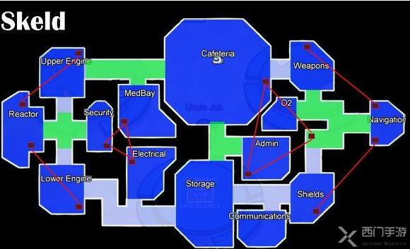 除了黄色感叹号区域是任务区域之外,还有一些通风管道(红线),潜伏者可以进入通风管道进行移动,绿色的格子是监控能看到的地方。