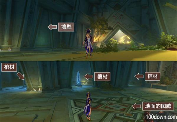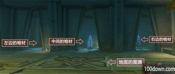 进入秘境以后,图示,靠近地面的图腾,墙壁的门就会打开,出现三个棺材,这是这个秘境的第1个解谜