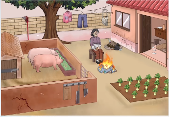 1、可以看到菜地里的头发。屋子里的一片狼藉,大嫂前的火堆。