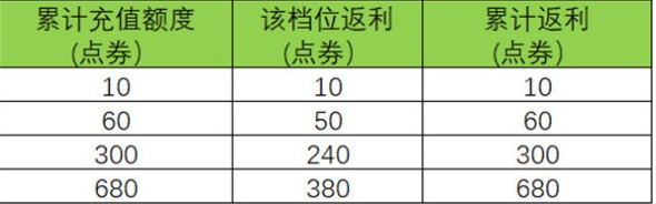 2.除此之外,最重要的是充值是双倍返利,就是充值到了对应的额度之后,就可以领取到等额的相同点券,最多返利能够达到680点券,这个活动还是比较良心的。