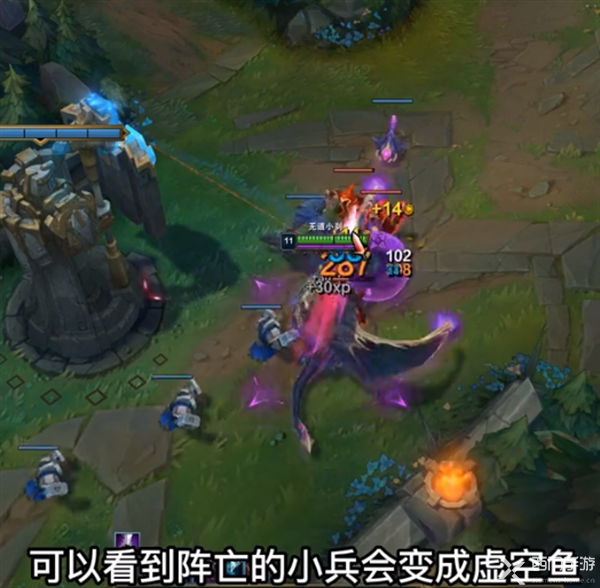 3、玩家拾取虚空珊瑚后就会改变形态,变形过程会对敌方造成伤害,此时攻击小兵,阵亡的小兵就会变成虚空鱼。