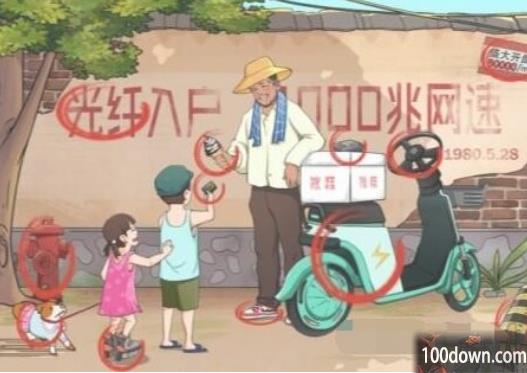 2、在后面额墙上印着【光纤标语】和【小广告】,大叔手里拿着【火炬冰淇淋】,旁边是【共享电车】;