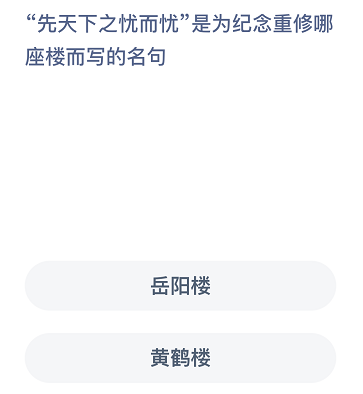 “先天下之忧而忧”是为纪念重修哪座楼而写的名句?这是今日的蚂蚁庄园小课堂的问题,很多玩家都比较关注这个话题,接下来就让小编为大家详细介绍一下,希望可以帮助到大家。