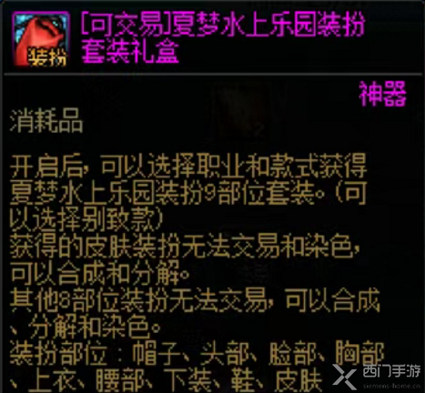 通过多买多送购买“[可交易]夏梦水上乐园装备套装礼盒”,打开可获得别致款装扮、别致款武器装扮;