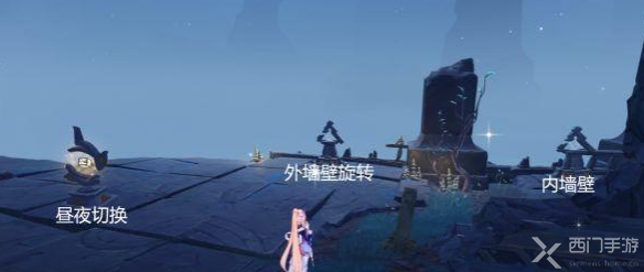 1、玩家到达常夜灵庙东北迷宫之后,可以看到有三个装置,这三个装置有不同的作用,如下图: