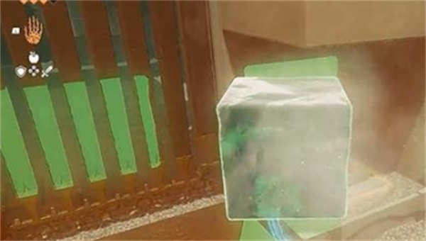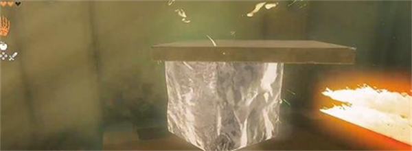 4、组合石块和石板,放置地磁的路上,使组合体滑至下方平台,玩家则顺风滑翔至对面平台。