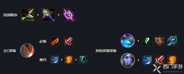 主C斯维因:羊刀、巨杀、饮血或水银也可以带正义副C亚索:一切物理攻击装都可,饮血、巨杀、正义之拳等辅助巴德:有回蓝装就给,没有就不给主坦:慎和纳尔,或纳尔和奥恩:一切肉装均可,反甲、龙牙、泰坦、石像鬼等。