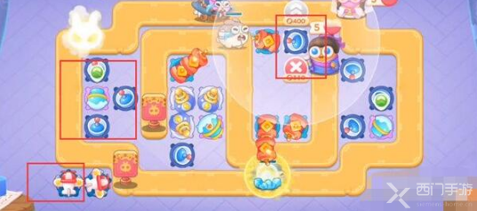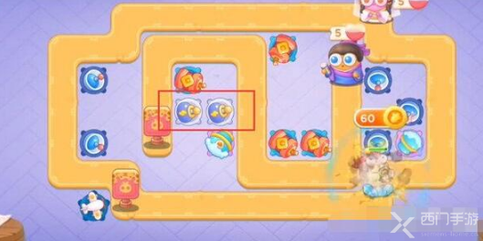 1、开局之后,先在中间那个那个大道具的下面放置两个炮仗,左侧放一个泡泡塔;