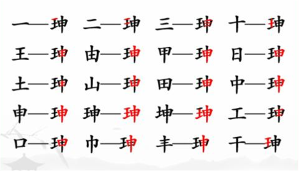 3、申、珅、坤、工、口、巾、丰、干。