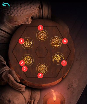 1、点击左边石像的鼓,可得知符号顺序,顺序对应墙上挂画的图案得知右边石像的密码如下;