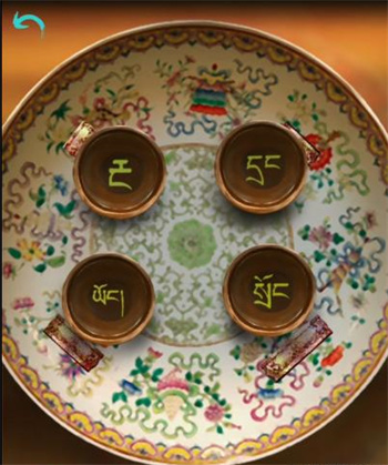 3、找到【茶壶】在四个杯子里倒水,打开中间的机关;