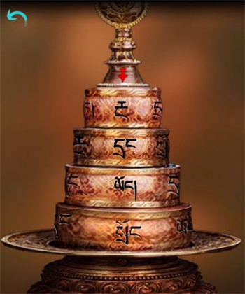 5、看完书后,按照下图所示打开机关得到【花纹鼓】,将鼓放到中间挂画后的凹槽里(没看完书和剧情会线索不足);