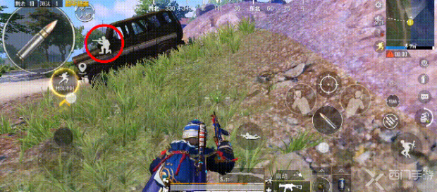由于多了一根手指进行操作,所以在屏幕的左上角,鸡仔只是简单的移动了四个可以固定使用的功能键(左手开火、下蹲/下车、万能标记和第一人称按键),初步解放双手的拇指,让操作更加的丝滑。