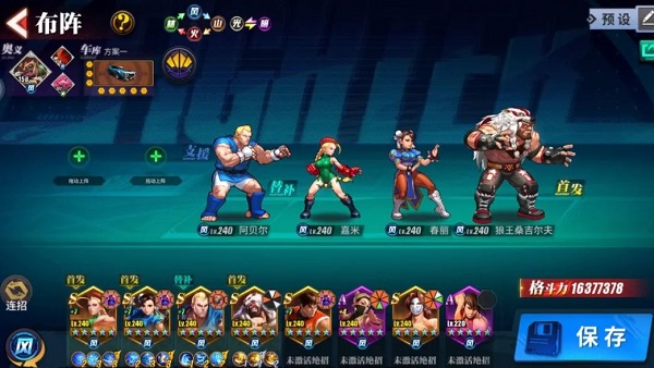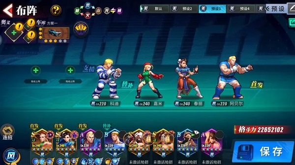 在PVP中控制类效果和保护类效果都非常重要,这套阵容可以嘉米先手打破甲,接桑吉尔夫连招1/超连招聚怪,接嘉米连招2再打破甲,最后接春丽连招3/超连招3输出;也可以在连招1的时候使用阿贝尔的连招1,加一个免疫伤害的护盾,保护一下后排的春丽和嘉米。