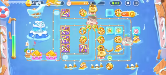 2、有钱之后在立刻右上角补一个鱼雷,会有潜水兔,玩家要小心,先从上往下清理道具,中间清完放鱼雷+船锚炮;