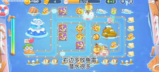 3、要着重在右侧区域放鱼雷,潜水兔一般是从右侧起点过来,可以放一圈鱼雷;
