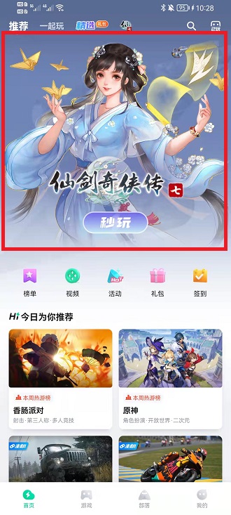 1、首先我们需要下载此平台手机软件,然后进入到其软件首页界面中登录自己的qq账号就会获得免费的游戏时长,在首页界面我们可以看到游戏活动的推荐图,我们点击推荐图进入到游戏界面;