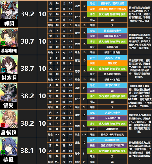 郸阴(最强单卡),慕容璇玑(雷系远距离法师),封寒月(最强冰法),解臾(最强铁卫),夏侯仪(最强火法),紫枫(最强辅法)