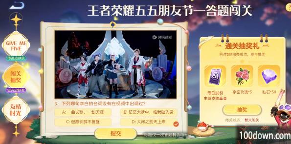 王者荣耀五五朋友节答题闯关答案在王者荣耀游戏中最近开启了五五朋友节的相关活动,其中有一个答题的社区活动,玩家需要答对问题才可以领取奖励,有玩家还不知道问题的答案是什么,接下来小编为大家带来了详细介绍。时间:2023-10-23 -
