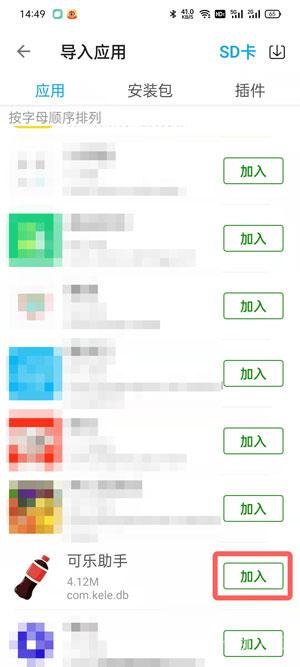 2、如果手机上安装了可乐助手,则在列表中找到并点击【加入】,只有安装包的则通过安装包列表找到加入;