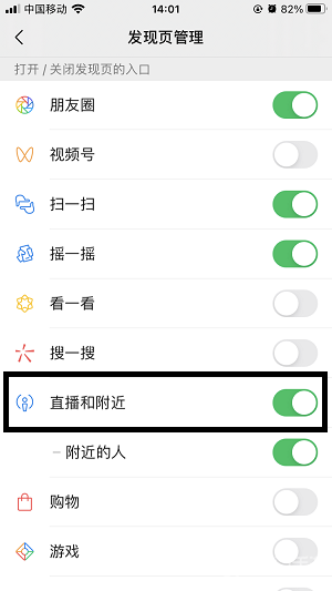 4.然后可以在这里看见一个【直播和附近】的选项菜单,直接开启这个内容;