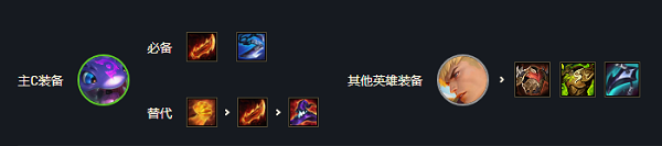 4、装备搭配:【大嘴】羊刀+巨人杀手;【盖伦】小反甲+狂徒铠甲+龙牙。大嘴有不错的攻击速度的同时搭配自身的攻速爆发力可以作为一个合格后排AD,而盖伦则需要足够坦度在前排吸收伤害。