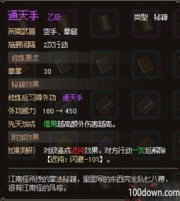 在大侠立志传游戏中有很多的武学,其中通天手是属于能用的武学,伤害和效果都还是可以的,喜欢堆掌法的可以练一下,有玩家还不知道该武学怎么获取,接下来小编为大家带来了详细介绍。