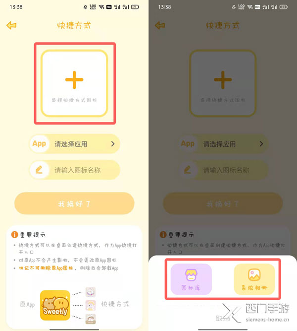 3、在首页点击上方的【换图标】服务,点击【选择快捷方式图标】按钮,选择需要使用图标保存路径;