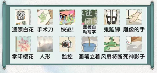 遗照白花、手术刀、快逃、黑板自动写字、鬼垫脚、雕像的手、掌印樱花、人形、监控、画笔立着、风扇将断、死神影子