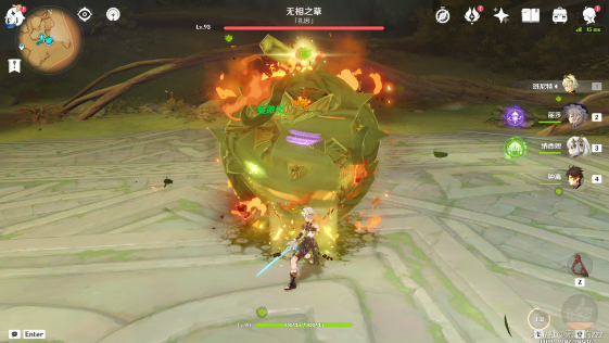 在无相之草进行攻击的时候,有一种攻击手段时是将自己变成一个球体,随后从天而降,我们需要在它落地的一瞬间,利用火元素烧毁它的外壳就行。
