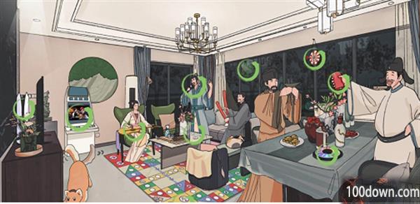 十二处娱乐物品:左边桌上的PS5,墙边的游戏机,手里的麦克风,桌下的逗狗玩具,地上的飞行棋盘,窗子上的孤寡青蛙,飞镖,长按三秒橘色衣服人可找到竹蜻蜓,李白手里的骰盅,桌子下的转盘,吉他,麻将。