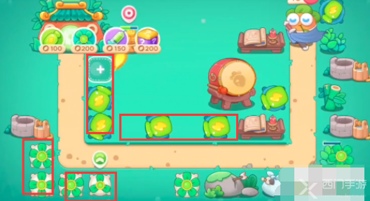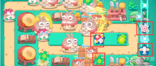 1、玩家可以先在右侧的位置放置毒针和炮塔,来清理道具和兔子;