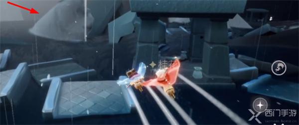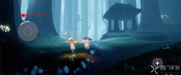 1、玩家们在调整视角进入水母图,然后飞向最后的一个残破的亭子后面,在燃挡住洞口的暗黑植物;