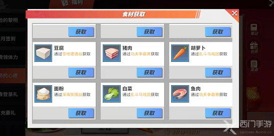 这些食材都可以在【寻宝之旅】玩法中获取,不同的食材需要站在不同的玩法中获取,其中: