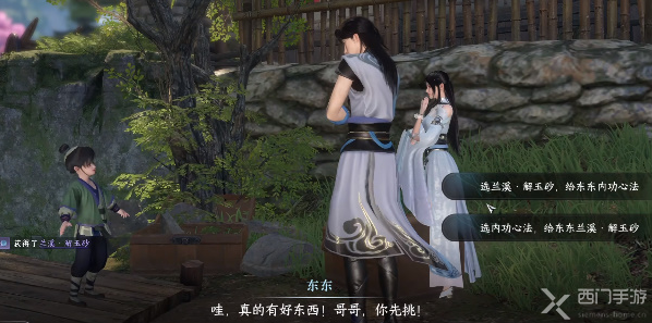 5、东东会将宝箱里的宝物给我们,这时候我们选择【选兰溪-解玉砂,给东东内功心法】;